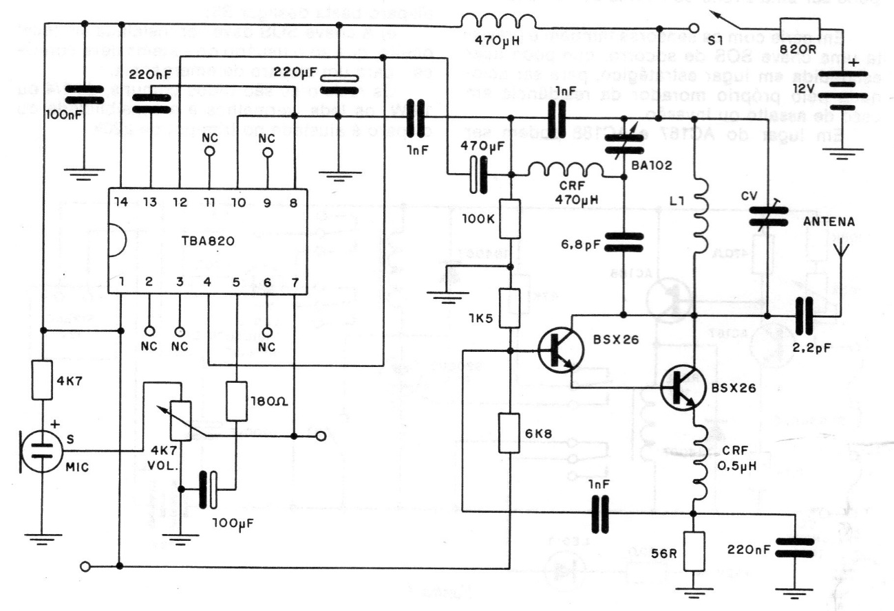 L1 consists of 4 turns of 22 or 24 AWG Wire in 1 cm form without core. This 1986 transmitter has good power and needs a source with good filtration or battery. The modulator circuit is an integrated amplifier that is not very common today and can be replaced by modern equivalents.