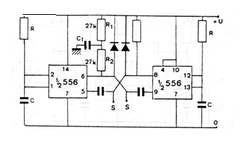 This circuit has an oscillating system in which the firing of one monostable reset the other. The time constants can be programmed separately, and the supply is made with voltages from 5 to 15 V. The circuit is from an old documentation and the capacitors without value are from 220 nF to 470 nF.