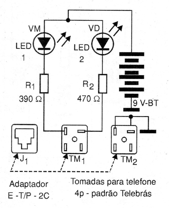 This circuit for testing telephone lines was found in a 2009 documentation, serving for the types in use at the time and still found in some locations. The indication is made through LEDs and the power can be made with 4 or 6 common batteries, or battery.