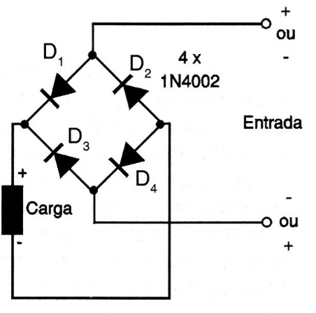 This circuit prevents the accidental inversion of the input polarity of a source to cause damage to a sensitive load. The diodes are for a maximum current of 1 A and a small voltage drop must be provided for them.