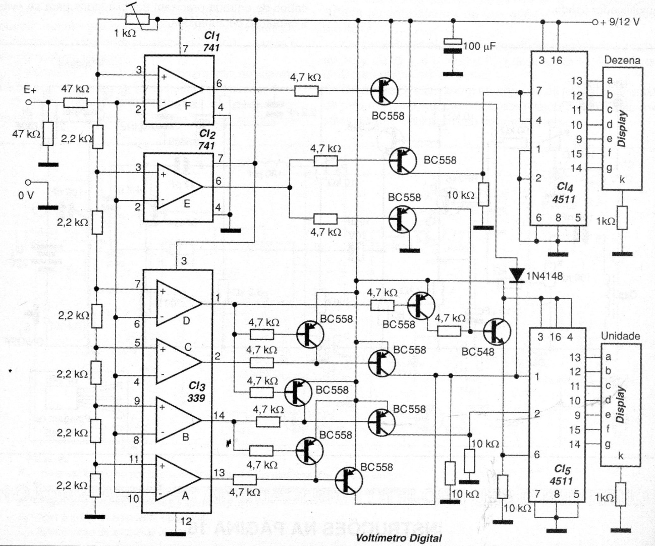 We present a circuit formed by six voltage comparators. Each comparator will analyze the voltage difference at every 2 V of the reference point, thus composing a total 12 V ladder that will be presented through the displays. For every 2 V applied to the input (E +), the corresponding value range 2 - 4 - 6 - 6 - 8 - 10 - 12 will appear on the display. The tens digit will be off until the value 8 and will light up when the input voltage exceeds 10 V, then the number 1 appears together with the number of the units. The circuit can be supplied with voltages of 9 or 12 V, which leads to the possibility of using a battery for portable operation. The circuit is not very accurate, as it depends on the values ​​of the components used. To adjust the circuit, connect a variable voltage source to the input (E +) and adjust the 1 k trimpot so that for each 2 V of input the corresponding value appears on the display in the scale of 2 and 2.