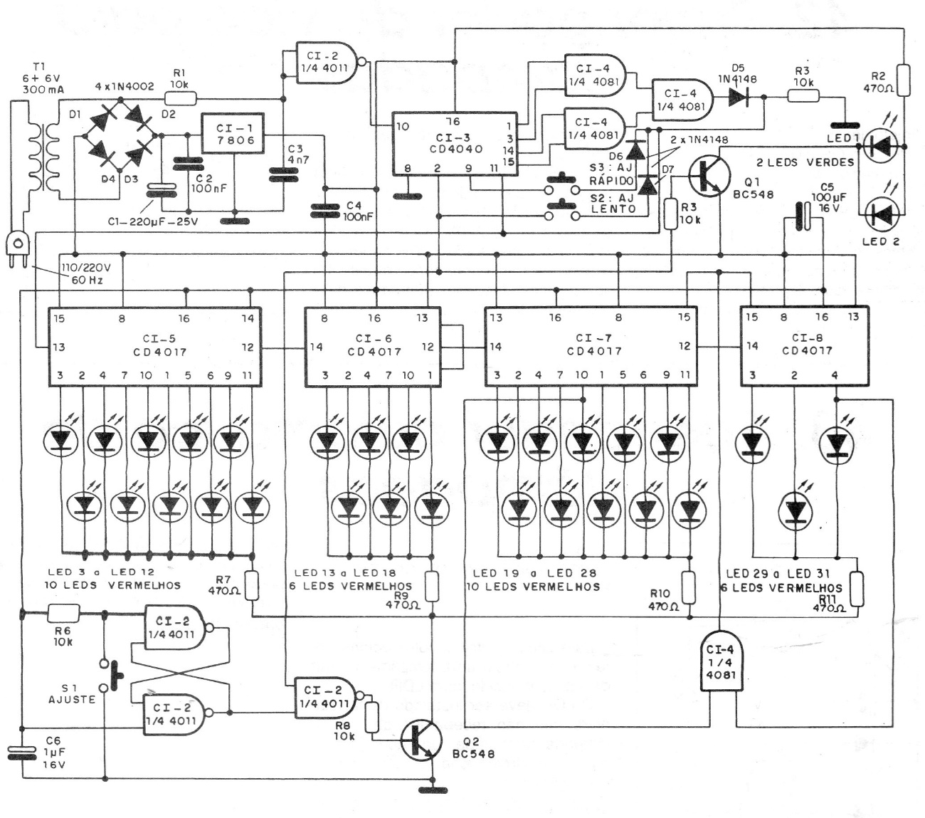 This 1990 circuit uses LEDs on a display with individual LEDs that form the hours and minutes. The circuit is synchronized by the frequency of the power grid, which guarantees good accuracy. The components used are CMOS yet easy to find in the specialized market. In the figure given we have an idea of the display.