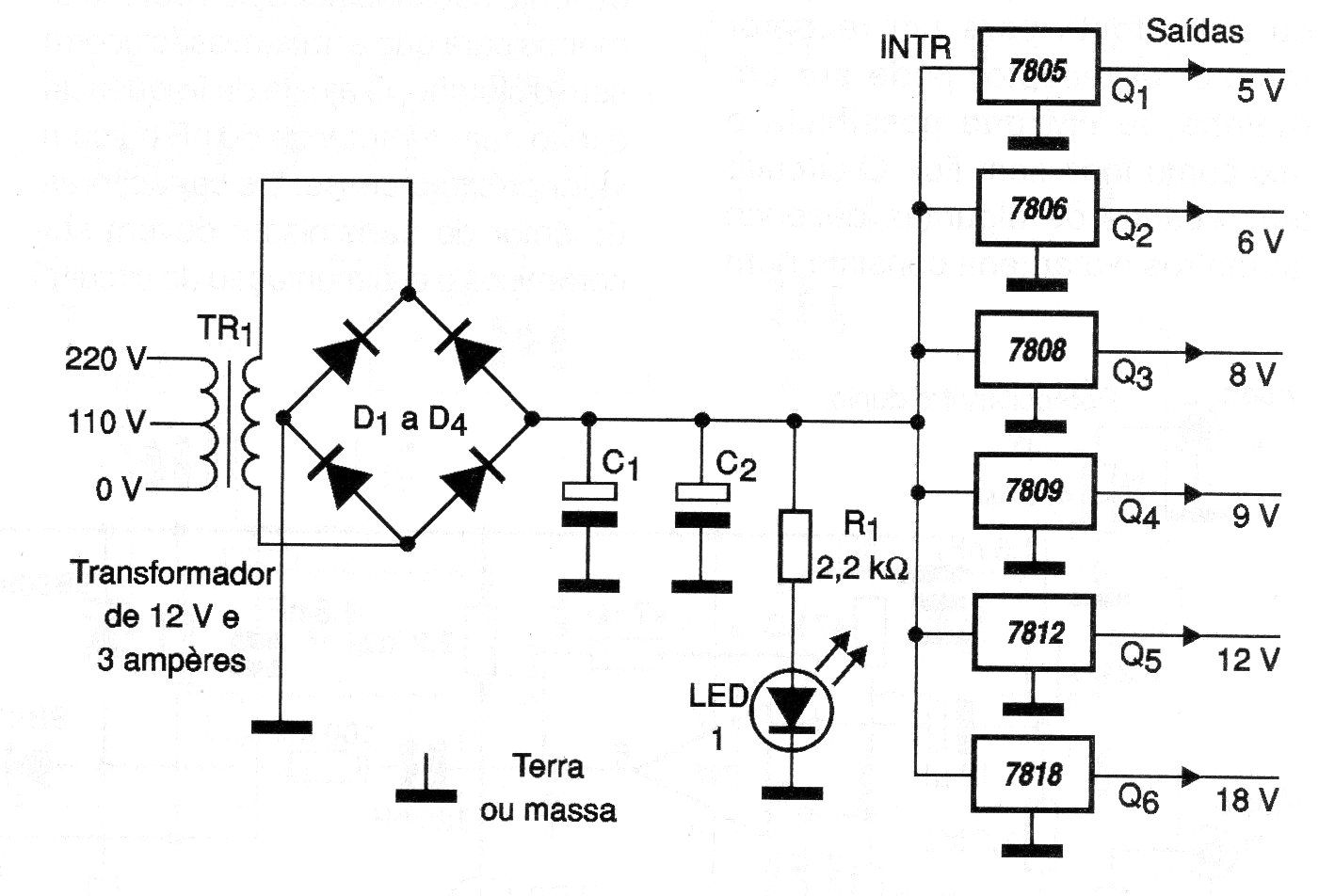 This conventional power supply uses integrated regulators for 1 A. Several regulators are used. The 3 A transformer allows a maximum of 3 outputs to be used with the maximum current. The integrated regulators must be mounted on heatsinks. The powered devices must have source decoupling capacitors at the input.