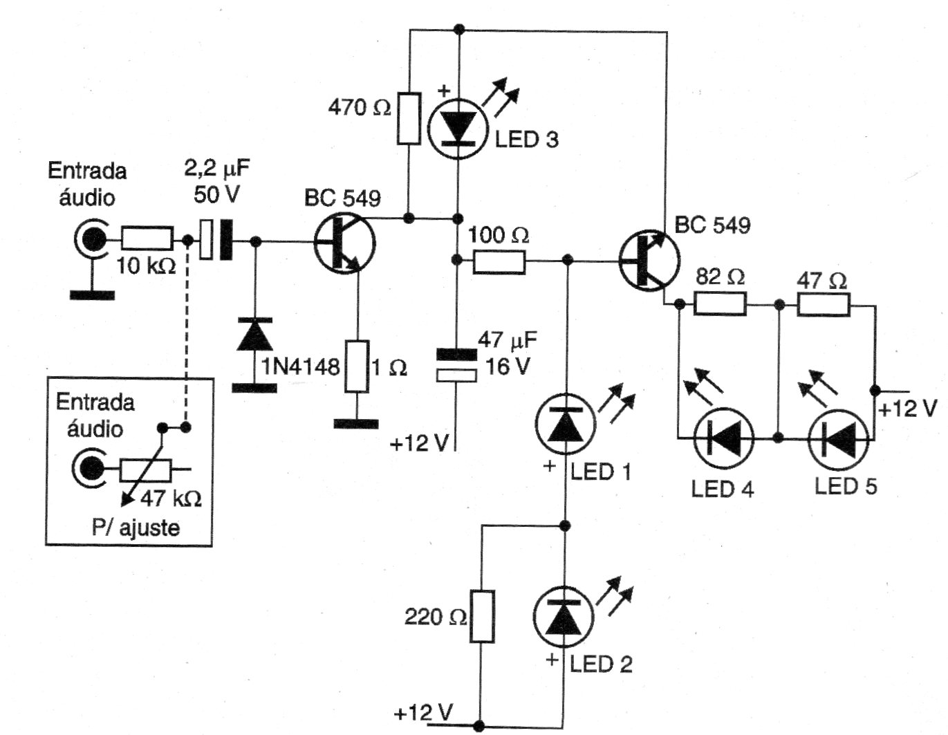 VU or Volume Units is a sound intensity indicator that can be installed on any stereo. The components used in this circuit are easy to obtain and the LEDs can be of any color. The LED blinks will accompany the music rhythm from LED1 to LED5 depending on the intensity of the sound. We also indicate how to add a potentiometer to adjust the sensitivity of the circuit. Transistors support equivalents and the circuit is wired to the speaker output of any stereo.