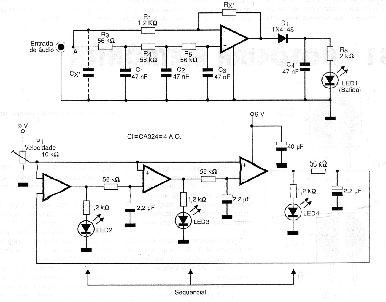 This circuit was found in a 1999 publication. Its purpose is to flash two LEDs according to the sound of an equipment and to randomly flash three LEDs at a controlled frequency