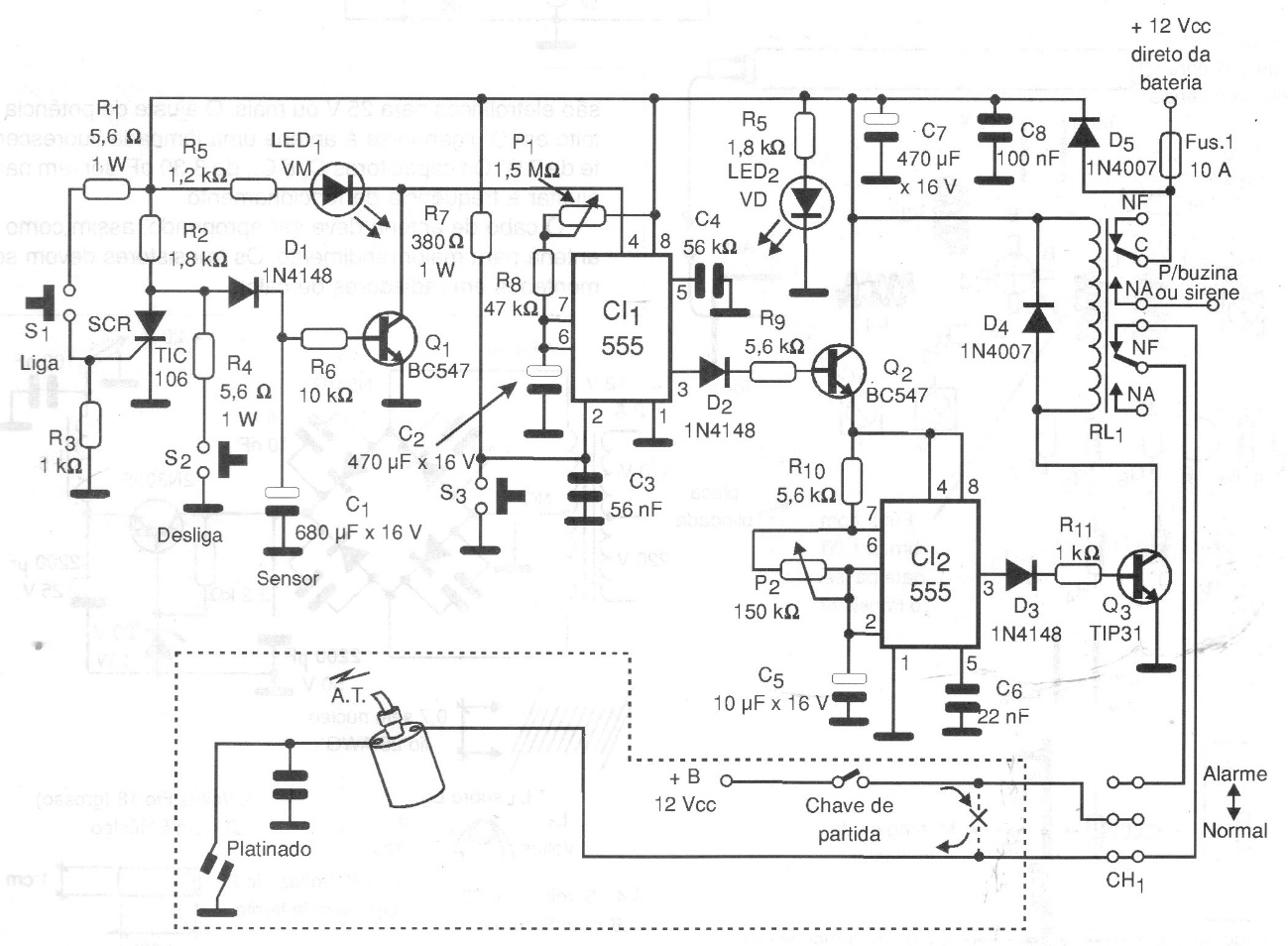 This efficient car alarm circuit was found in a 1999 documentation, considering the characteristics of the electrical system of vehicles at the time. The circuit inhibits the operation of the car and, in addition, triggers the horn.