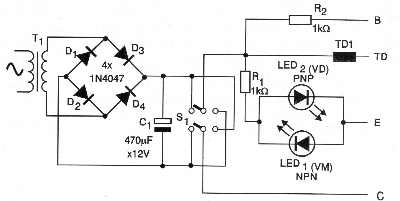 This is a multi-component tester with visual indication by LED and polarity selection in the test. The transformer is 6 V with a current of 100 mA to 300 mA. The circuit is capable of testing NPN and PNP transistors selected in switch S1.