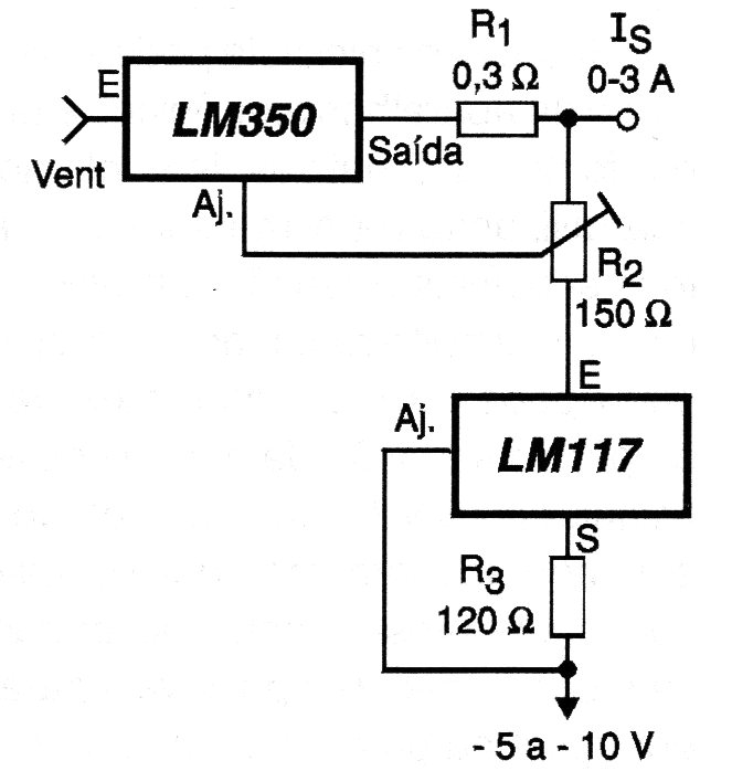 This circuit is suggested by National Semiconductor (now Texas) in an old manual. The circuit requires an auxiliary source of negative voltage. The LM350 integrated circuit can control a maximum current of 3 A and must be mounted on a heat sink.