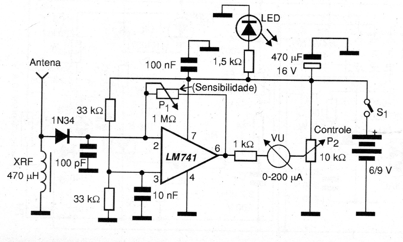 This circuit is from a 2004 documentation serving for signals from 1 MHz to 160 MHz. The antenna is of the telescopic type and the analog instrument is of the type found in old sound equipment.
