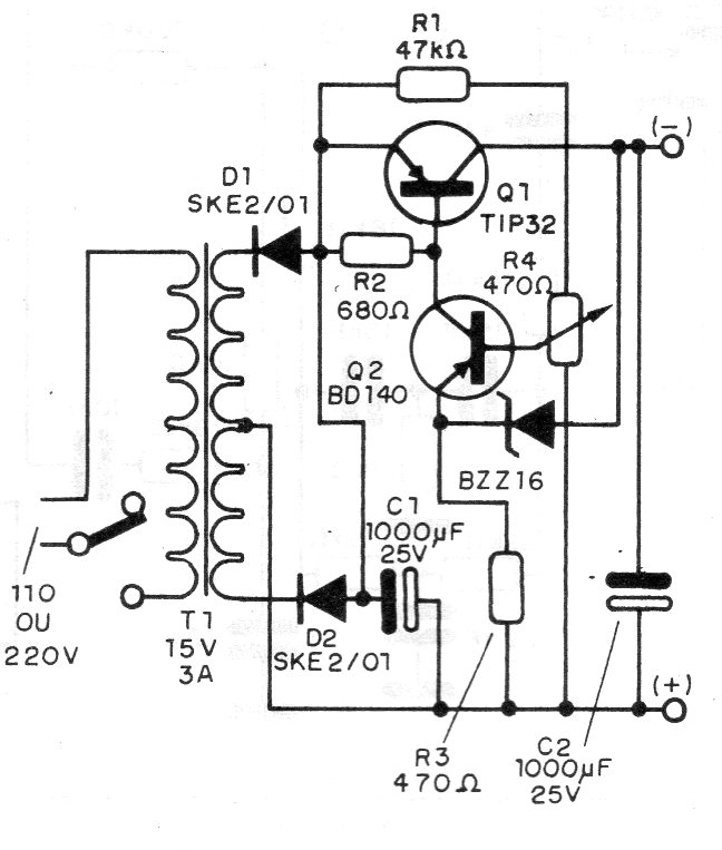 This conventional 12 V power supply stabilized with 2 A current was found in a 1995 documentation. Its conventional configuration appears several times on this website. Transistor Q1 must be provided with a heat sink.