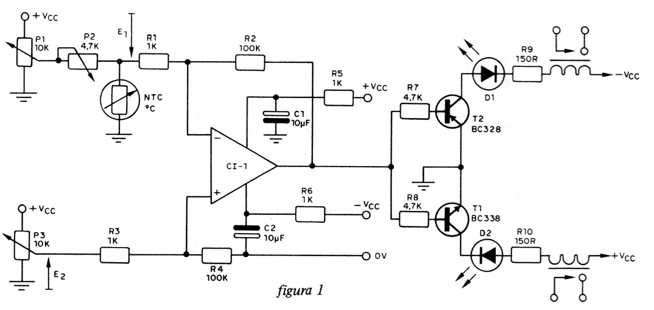 This circuit was found in a 1986 documentation and can use any operational amplifier like the 741 or comparator like the LM339, hence the pinout is not indicated. The supply can be made with 12 V, which is the voltage of the relay and the NTC must have a resistance of the order of 10 k at room temperature.