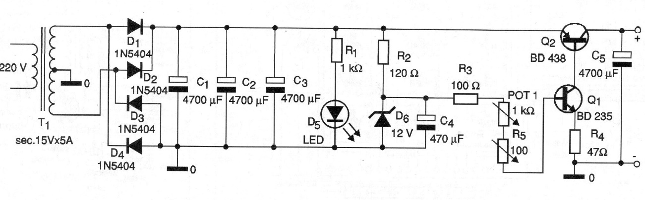 The power supply shown can supply voltages of approximately 0 V to 12 V with a maximum current of 4.5 A, presenting excellent filtration and fine adjustment for greater precision in obtaining the desired output voltage. This source can be used to power small and medium power amplifiers. The output transistors must be provided with heat sinks. All resistors have a 5% tolerance and 1/8 W dissipation, except R4, which must be 5 A. The diodes and transistors admit equivalent.