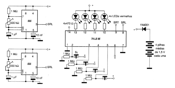 This circuit is from a simple TTL sequential system using 4 LEDs. The experimental circuit must be powered by 5 V or 4 batteries with a diode. Clocks of two types are given together with the diagram.