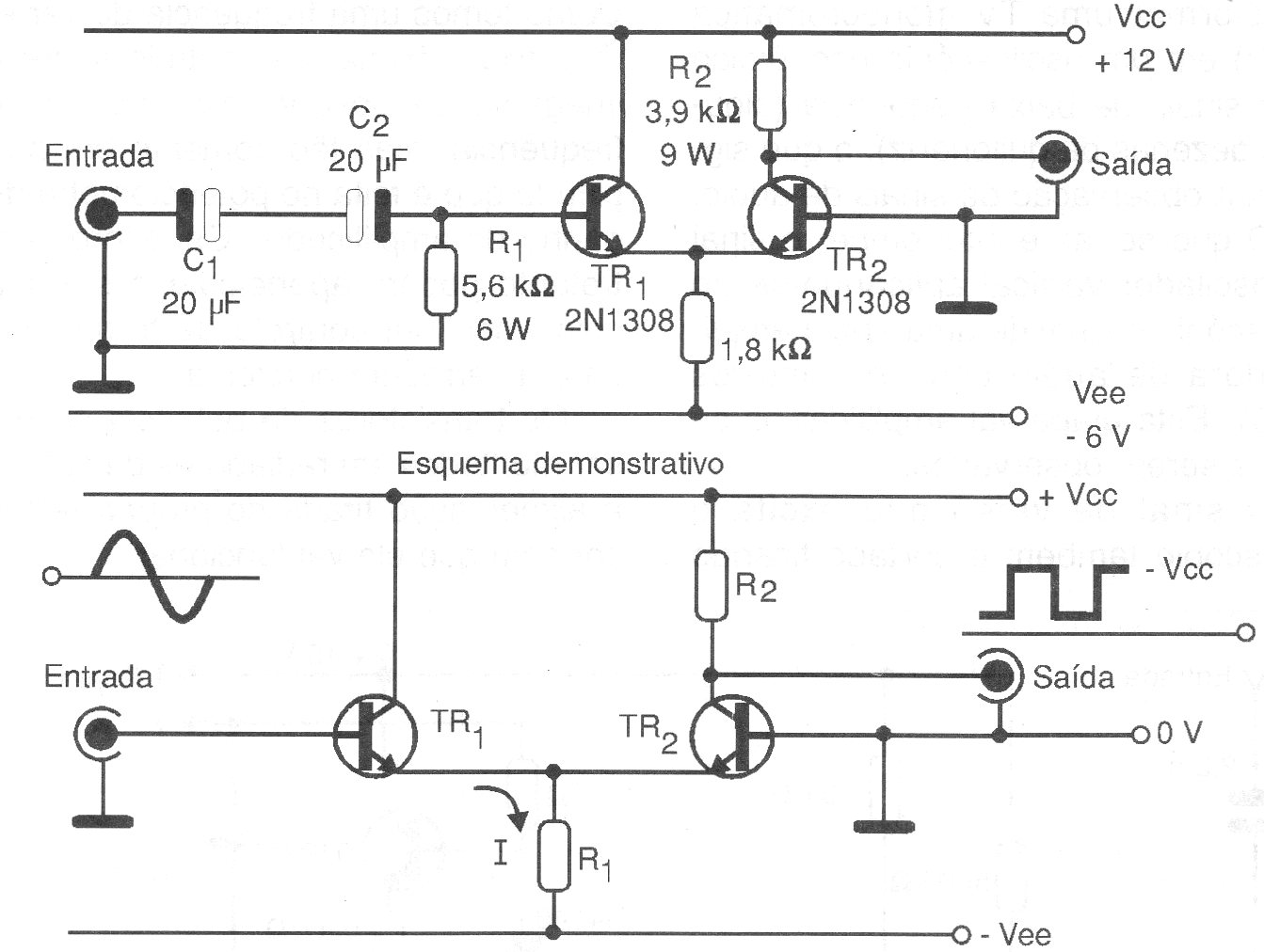 We found this simple circuit in a 1999 documentation. It converts low-intensity sinusoidal signals (a few hundred millivolts at most) into rectangular signals. The circuit is powered by 12 V and consists of a trigger.