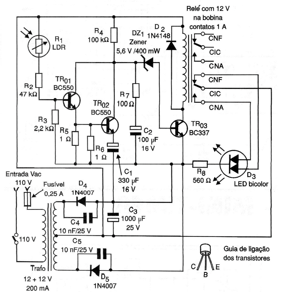 We found this light relay circuit in year 2000 documentation. The relay is 6 V and the circuit includes a power supply. It can be used to control various devices from the incident light in the LDR.