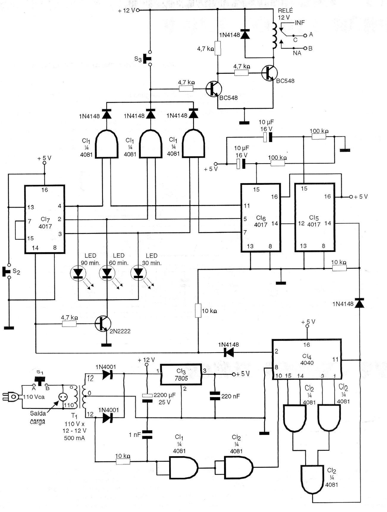 The times for this timer, found in a 1997 documentation, can be adjusted to 30, 60 and 90 minutes. The circuit uses CMOS technology and at the end of the timing it activates a 12 V relay. The circuit is precise by using the frequency of the power grid for its synchronization.