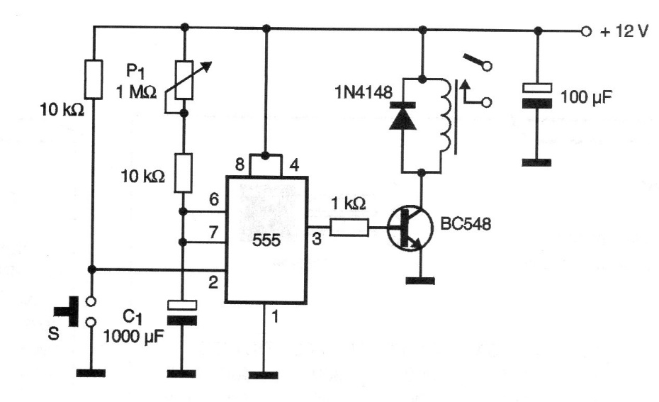 This is one of many timer settings with the 555 found on this site. This is the traditional version found in a 2 000 documentation for 12 V relays. Changing the relay, the circuit also works with 6 V. The C1 time, which can have a maximum value of 2 200 uF for times up to more than 1 hour.