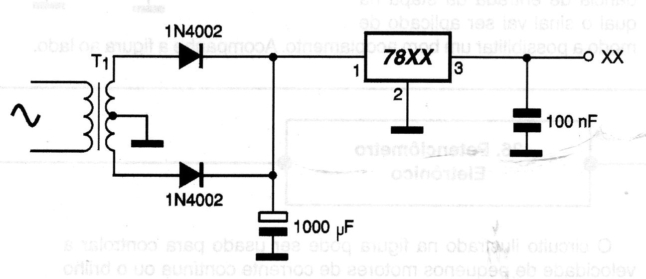 In this circuit, xx can be 05, 06, 12 or 15 for output voltages of these values. The integrated circuit must have a heat sink and the transformer has a secondary of 6, 7.5, 12 or 15 V for voltages of 5/6, 12 and 15 V. The maximum current is 5 A.