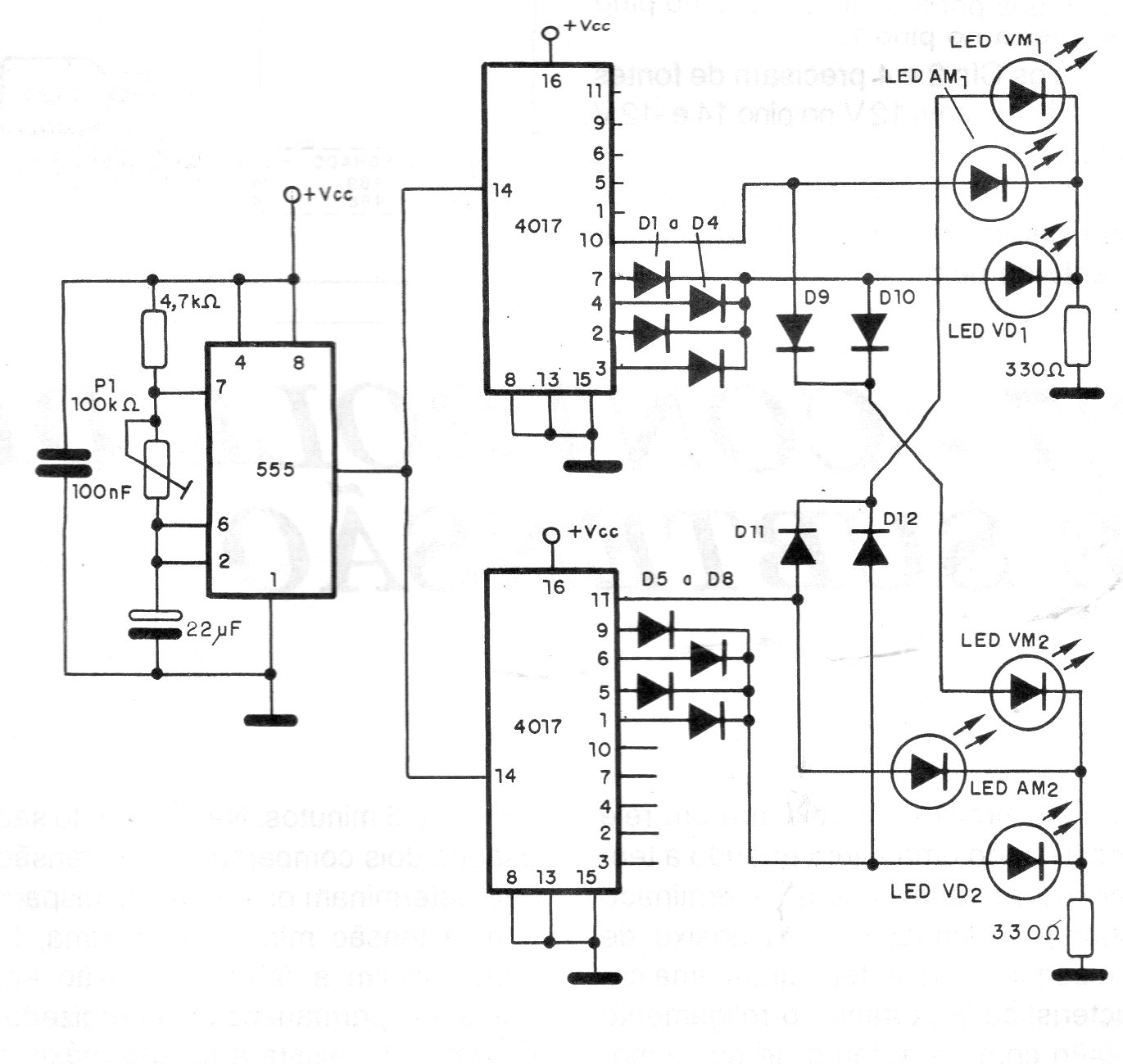 This circuit controls 6 LEDs in two sets with the phase change cycles controlled by a 555 oscillator. The circuit can be powered by voltages between 6 and 12 V.