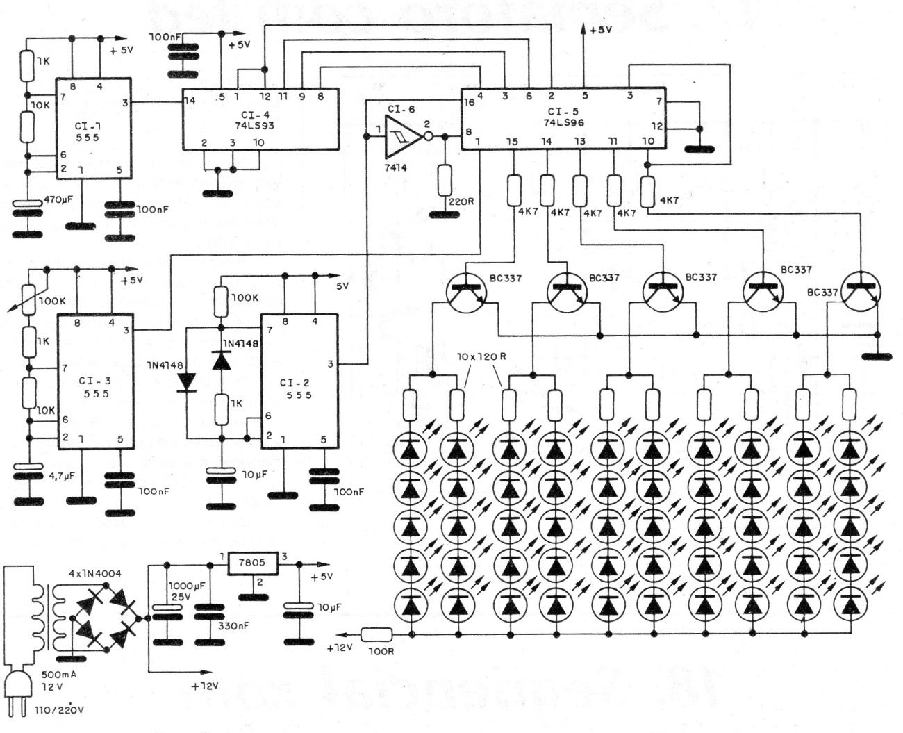 We found this circuit in a 1986 documentation. It is based on TTL integrated circuits that can be found quite easily. The circuit includes a 5 V supply, and the adjustment of the effect is achieved through a potentiometer. The circuit can be adapted to control SCRs and higher power lamps.
