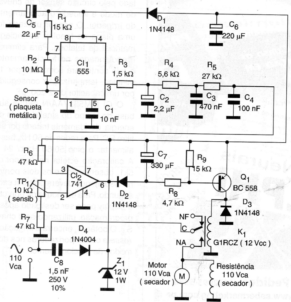 Of course, the design indicates a specific application for a touch switch. Thus, analyzing the circuit from the point of view of a touch drive, it can be adapted for several other applications. In the diagram, it was only necessary to indicate that the line going to pin 7 of the 741 is the power supply line for the circuit that will be connected to a 12 V source. We also note that it will be interesting to connect a 100 k ohms resistor in series with the sensor plate.