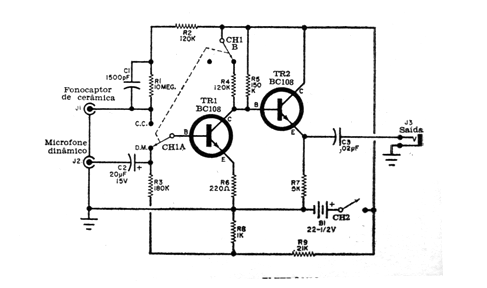 This circuit is from a publication from the 60s. The circuit, with minor changes, can be assembled with current general-purpose transistors such as the BC548. The circuit has two inputs depending on the type of signal source used.