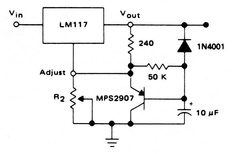 In this circuit, the output voltage is slowly established, thus avoiding the impact when connecting to sensitive circuits. The maximum current is 1.5 A, but the LM350 can be used for 3 A. The integrated circuit must be equipped with a heatsink.