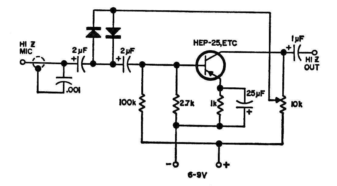 We found this simple preamp circuit with only one transistor in a documentation from the 70s. The transistor can be the BC558, and the diodes are for general use. The source must have good filtering.