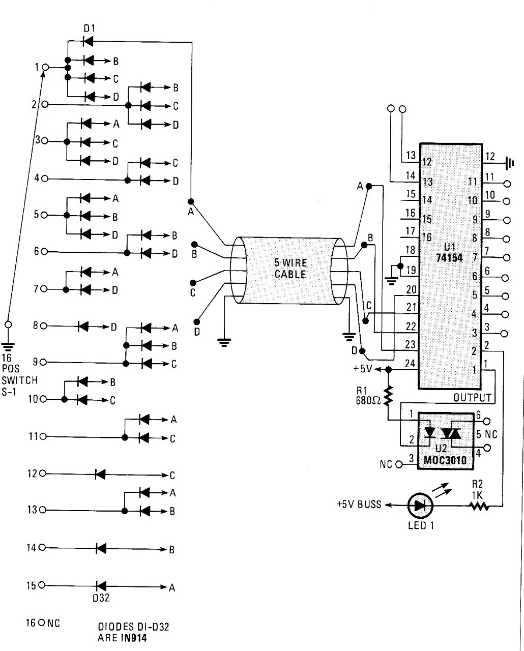 This is an interesting solution for intelligent load control using a cable and a diode array to obtain selectable multiple drive. For the logic sector, the supply is 5 V, and the circuit can serve as the basis for a similar micro controlled project. The circuit was found in an old American publication from 1988.