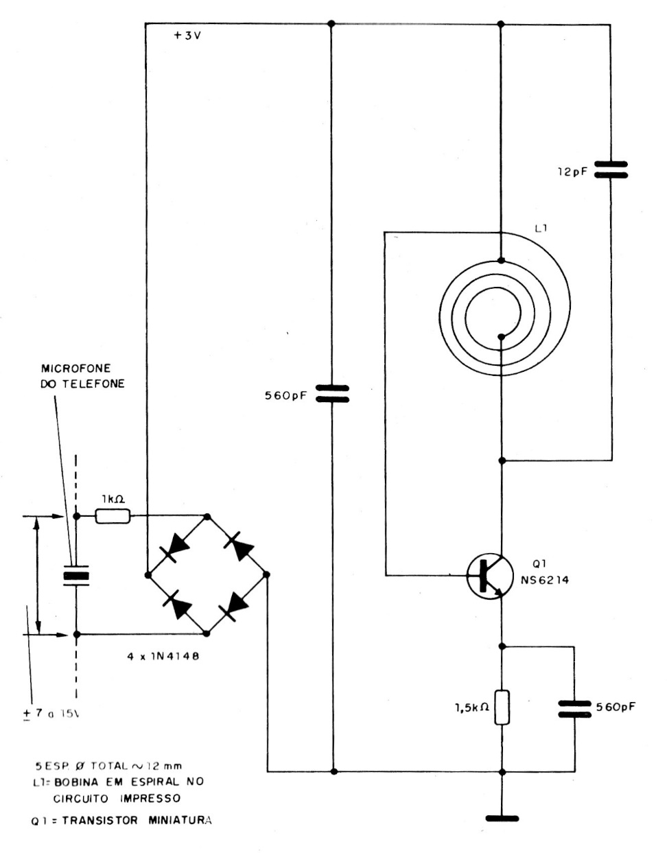 This circuit was found in a 90's espionage publication and serves for analog lines. The circuit is simple, emitting a signal in the FM range, whose frequency is adjusted by tightening or stretching the coil. The transistor can be the BF494 and the range is in the order of a few tens of meters.