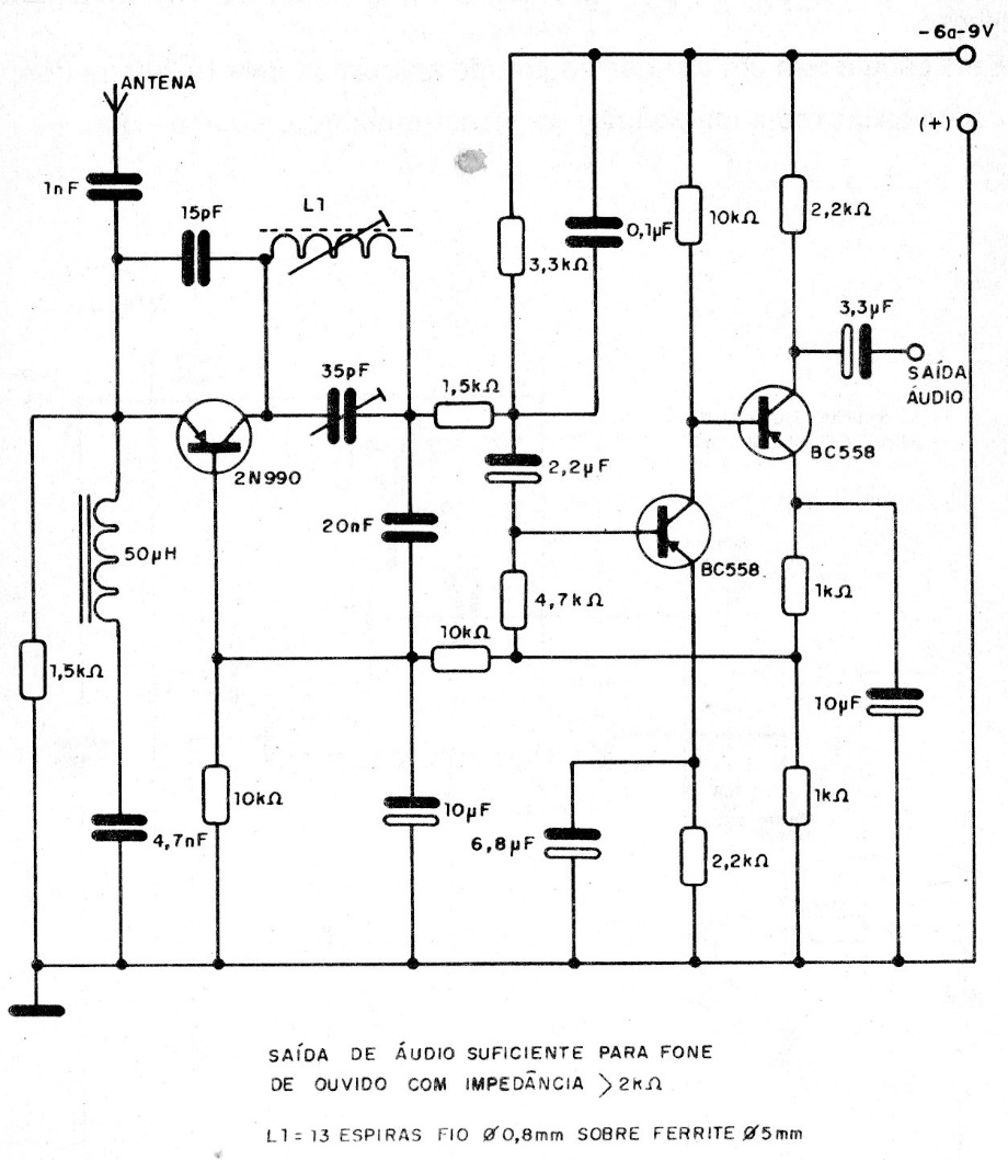 This receiver was obtained in a documentation from the 90's and is of the super-regenerative type. We can use it on remote control or on an intercom. The coil data is provided next to the diagram. An audio stage must be added to listen to the earpiece or speaker.