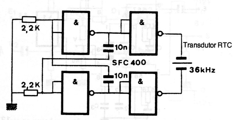 The ports used in this ultrasonic remote-control transmitter are TTL, requiring a 5 V supply. The transducer is a piezoelectric type, not very common today.