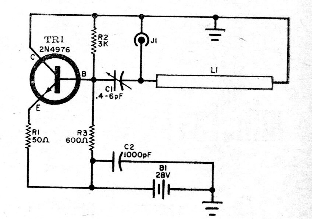 This circuit was found in a 1966 publication using a microwave transistor of the time. The circuit provides 1 W of power and L1, it is a bar cut to resonate at the desired frequency. Observe the high supply voltage.