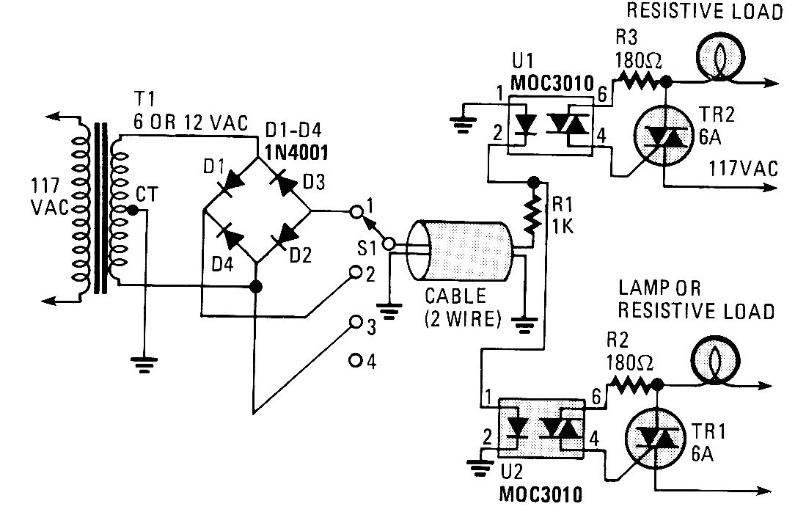 This interesting control circuit was found in an Electronics Now from 1988. Through it we can control two power loads with triacs through optical couplers using a single cable. The triacs are according to the load and the couplers admit equivalents and must be mounted on heat sinks.
