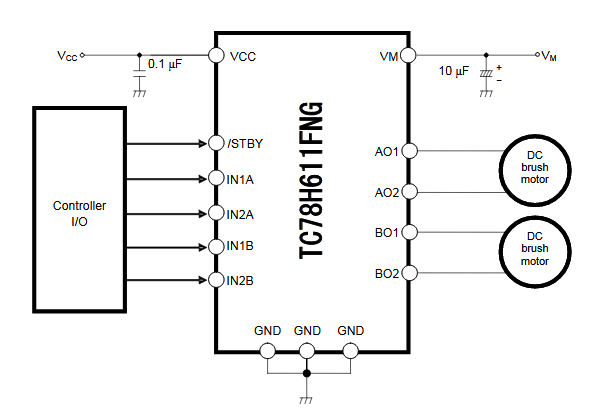 Toshiba's TCH8H611FNG integrated circuit makes it possible to control stepper motors up to 0.8 A with an input voltage of 5.5 V. For the motor, the maximum voltage is 18 V. The two H bridges of the integrated circuit can be used to control two motors.