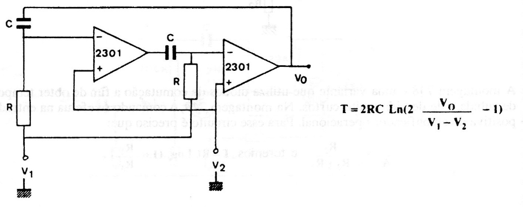 This variable has its frequency controlled by voltages V1 and V2. The circuit is based on documentation from the 1980s and can be implemented with modern operational amplifiers. The power supply must be symmetrical.