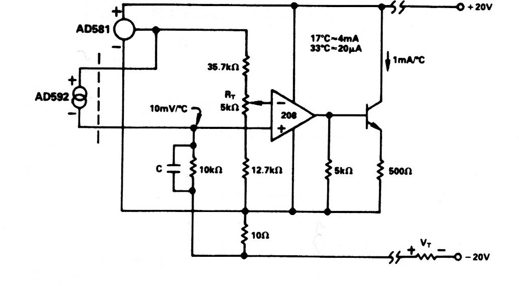 This circuit uses an unusual sensor nowadays, but the configuration can be adapted to more modern types, as well as the operational amplifier. The circuit is from an 80's documentation.