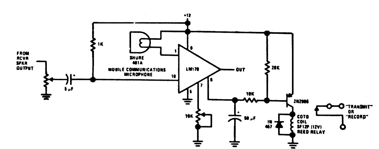 This circuit can be used at the same time as a preamplifier and voice by activating a relay when speaking into a microphone. The circuit is from an old documentation for radio amateurs, and modern equivalent operational amplifiers can be used.