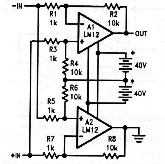This symmetrical source configuration circuit for the LM12, a high-power operational amplifier from National Semiconductor. The integrated circuit is not very common in our market.