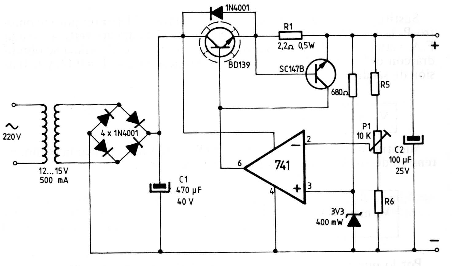 We found this power supply for voltages up to 15 V using a 741 operational as a regulator in a European documentation from 1991. The power transistor admits equivalents and must be mounted in a heatsink. The general-purpose transistor can be the BC547.