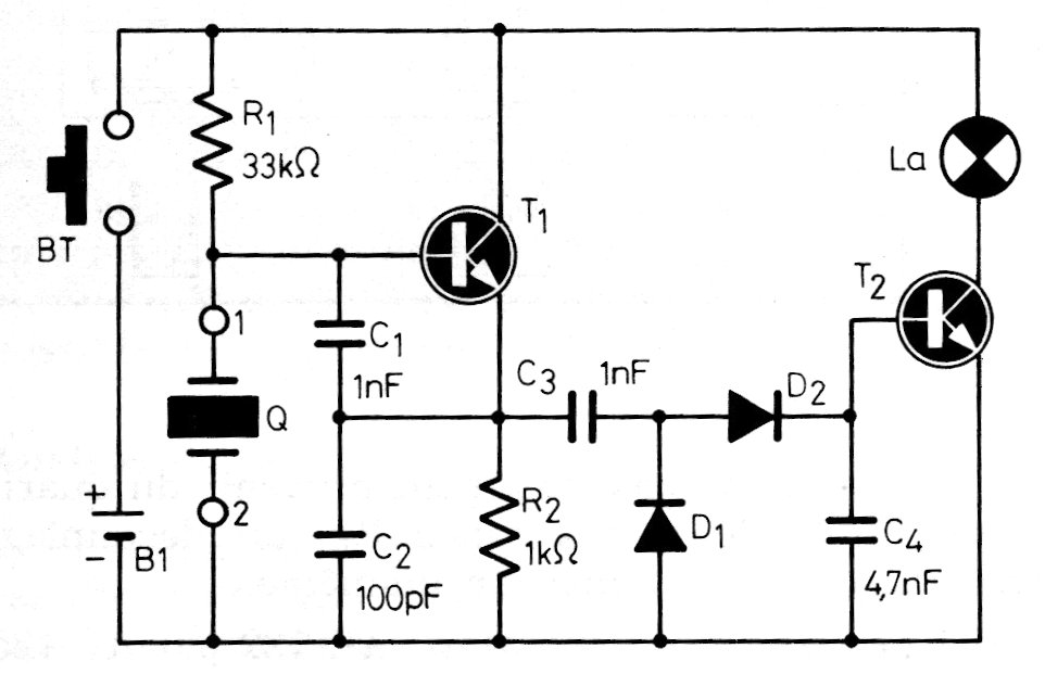 This circuit can test quartz crystals from 3.5 to 90 MHz. Its supply can be made with voltages from 8 to 12 V. The transistor T1 can be the BF494 or BF495 and the transistor T2 a BC548. When switching on the lamp, an LED in series with a 1k resistor can be used.
