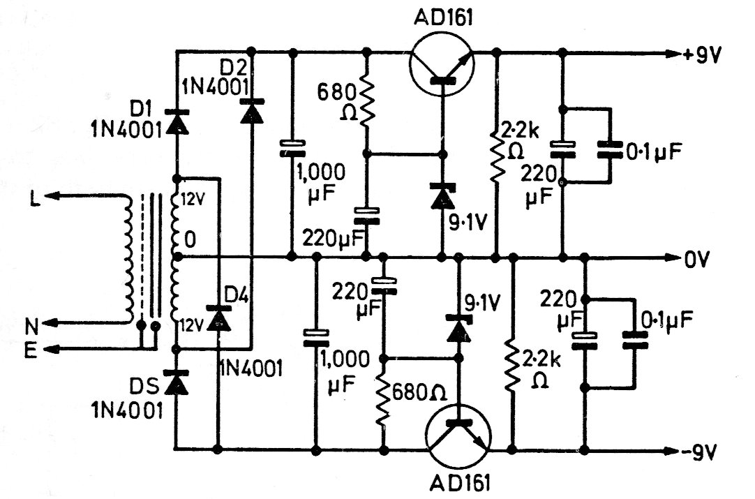 The transistors of this symmetrical source from an old publication can be replaced by modern equivalents such as BD135 and BD136. With this, the current can supply currents up to about 300 mA. Transistors must be mounted on heat sinks and the output voltage changed by changing the zener diodes.