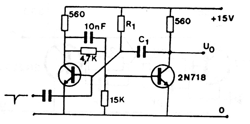 Equivalent transistors, such as the BC548, can be used in this circuit that we find in documentation from the 1980s. The output times are given by capacitor C1. The input capacitor depends on the clock characteristics, being able to assume values between 10 nF and 470 nF typically.