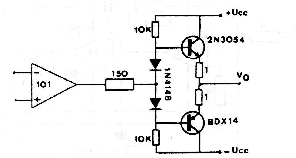 Higher power for an operational amplifier can be obtained with a step with complementary output. The transistors can also be the BD135 and BD136 for a more current application, and the circuit is valid for other operational ones.