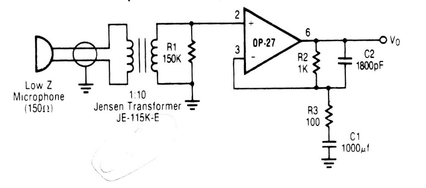 The low-noise amplifier shown uses a rare Raytheon operational amplifier today. The circuit can be implemented with more modern operators and the power source must be symmetrical.
