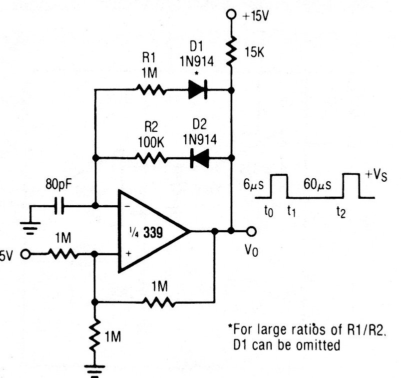 This circuit generates pulses of 10% active cycle, which can be changed by changing the value ratio between R1 and R2. The circuit has the basic frequency determined by the capacitor and applies to other comparators in the same series.