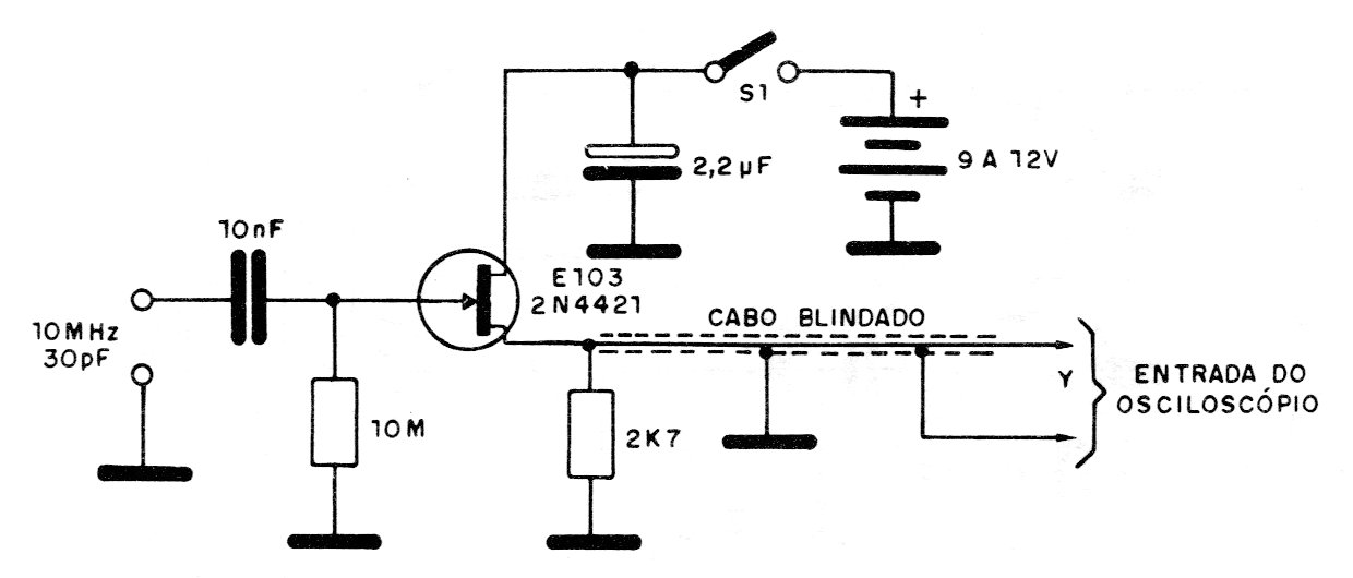 This circuit is intended to match impedances for observing signals on an oscilloscope. The FET supports equivalents and both signal input and output cables must be shielded. The input capacitance is 30pF and the supply can be made with voltages from 9 to 12 V.