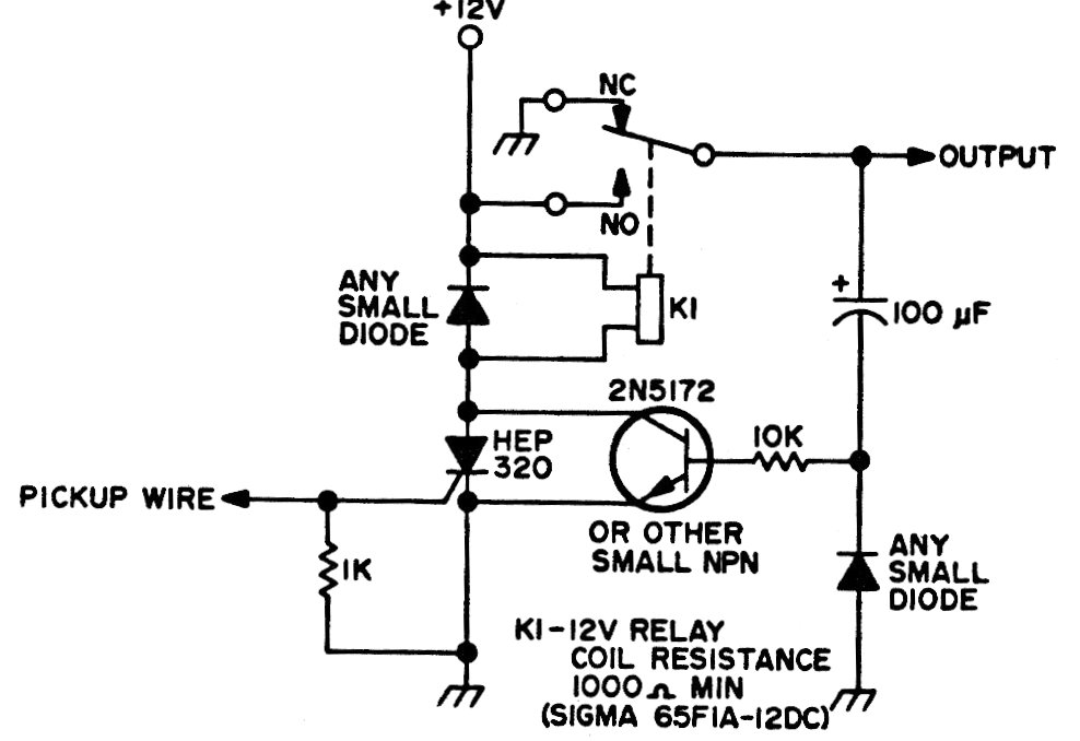 This circuit, suggested by a 1975 documentation, detects an electrical discharge in a storm by disconnecting the load connected to the relay. The antenna is a long external wire. Care must be taken with the installation.