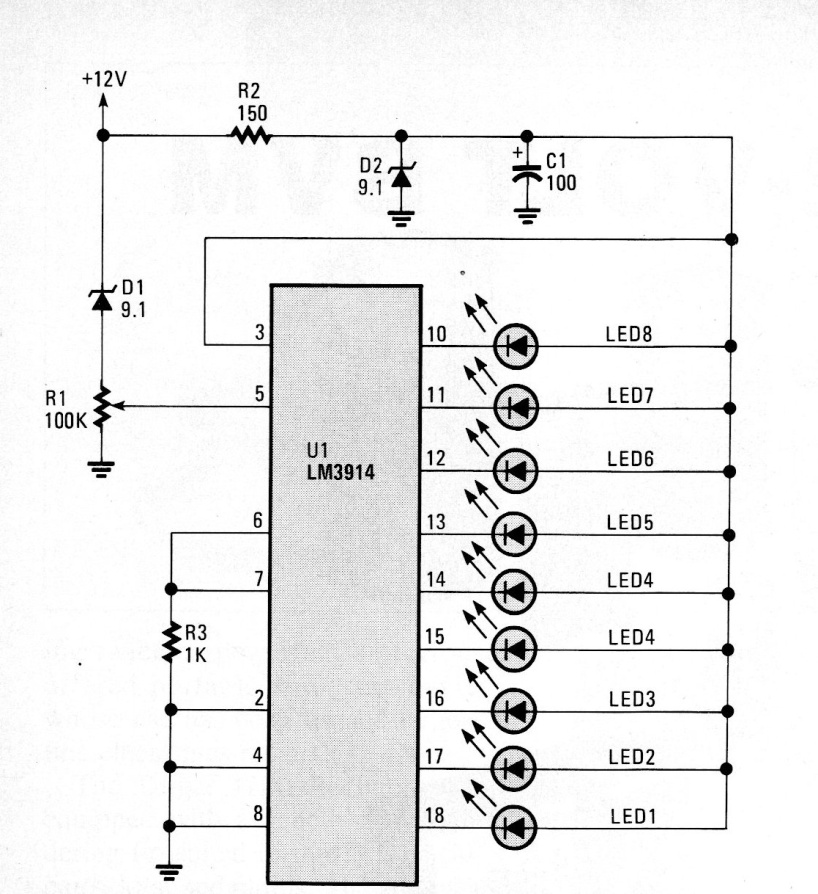 This circuit is from a 1988 American magazine, but it is still up to date due to the components it uses. It is a bargraph that is used to monitor 12 V batteries, but that can be adjusted to monitor other voltage ranges.