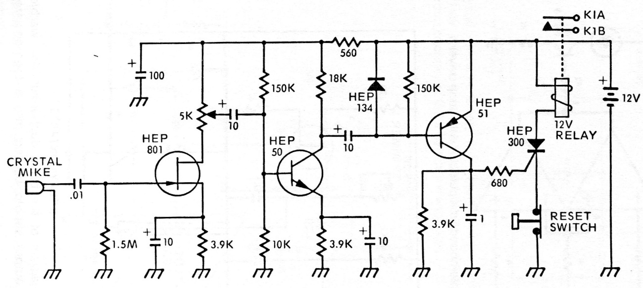 This sensitive sound or noise activated key can be used in an alarm system. The circuit is from an old documentation (1975) and the semiconductors must be replaced by modern types. The FET can be the BF245 and the transistors the pair BC548 and BC548.
